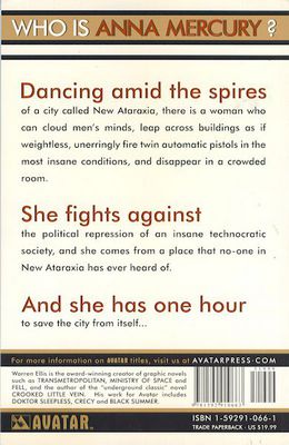 Warren Ellis introduces you to the sultry Anna Mercury in this collection of the first action-packed series! Dancing amid the spires of a city called New Ataraxia, there is a woman who can cloud men's minds, leap across buildings as if weightless, unerringly fire twin automatic pistols in the most insane conditions, and disappear in a crowded room. She fights against the political repression of an insane technocratic society, and she comes from a place that no one in New Ataraxia has ever heard of... and she's got one hour to save the city from itself! A high-octane blend of The Shadow, Tomb Raider, retro-punk science fiction, and 21st century Weird Pulp Action, Anna Mercury is a headlong adventure serial about a beautiful and mysterious spy-adventurer who is not what she seems. Anna Mercury Volume 1 features all five of the original issues with art by all-new talent Facundo Percio as well as a special super-sized cover gallery!