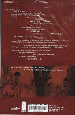 Written by ROBERT KIRKMAN Art & cover by TONY MOORE CONCEPT: An epidemic of apocalyptic proportions has swept the globe, causing the dead to rise and feed on the living. In a matter of months society has crumbled: There is no government, no grocery stores, no mail delivery, no cable TV. In a world ruled by the dead, we are forced to finally begin living. THIS VOLUME: Rick Grimes is not prepared for this. A couple months ago he was a small town cop who had never fired a shot and only ever saw one dead body. Separated from his family he must now sort through the death and confusion to try and find his wife and son. Collects THE WALKING DEAD #1-6. RETAILER WARNING: MAY NOT BE SUITABLE FOR ALL AGES