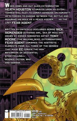 When down-and-out alien exterminator, Heath Huston stumbles upon an extraterrestrial legion of amoebas preparing to annihilate the Earth, he's forced to choose between the bottle and resuming his role as a peacekeeper, as The Last Fear Agent. Heath's former band of soldiers, the Fear Agents was comprised of a group of the last remaining humans on Earth, whose sworn duty was the protection of their homeworld against alien invaders. A number of years after preventing a large-scale invasion of Earth, the Fear Agents were all slaughtered in a mysterious incident. Written by critically acclaimed scribe Rick Remender (Sea of Red; Strange Girl) and drawn by Eisner nominated artist Tony Moore (The Walking Dead; Exterminators). * Collecting Fear Agent #1-4.